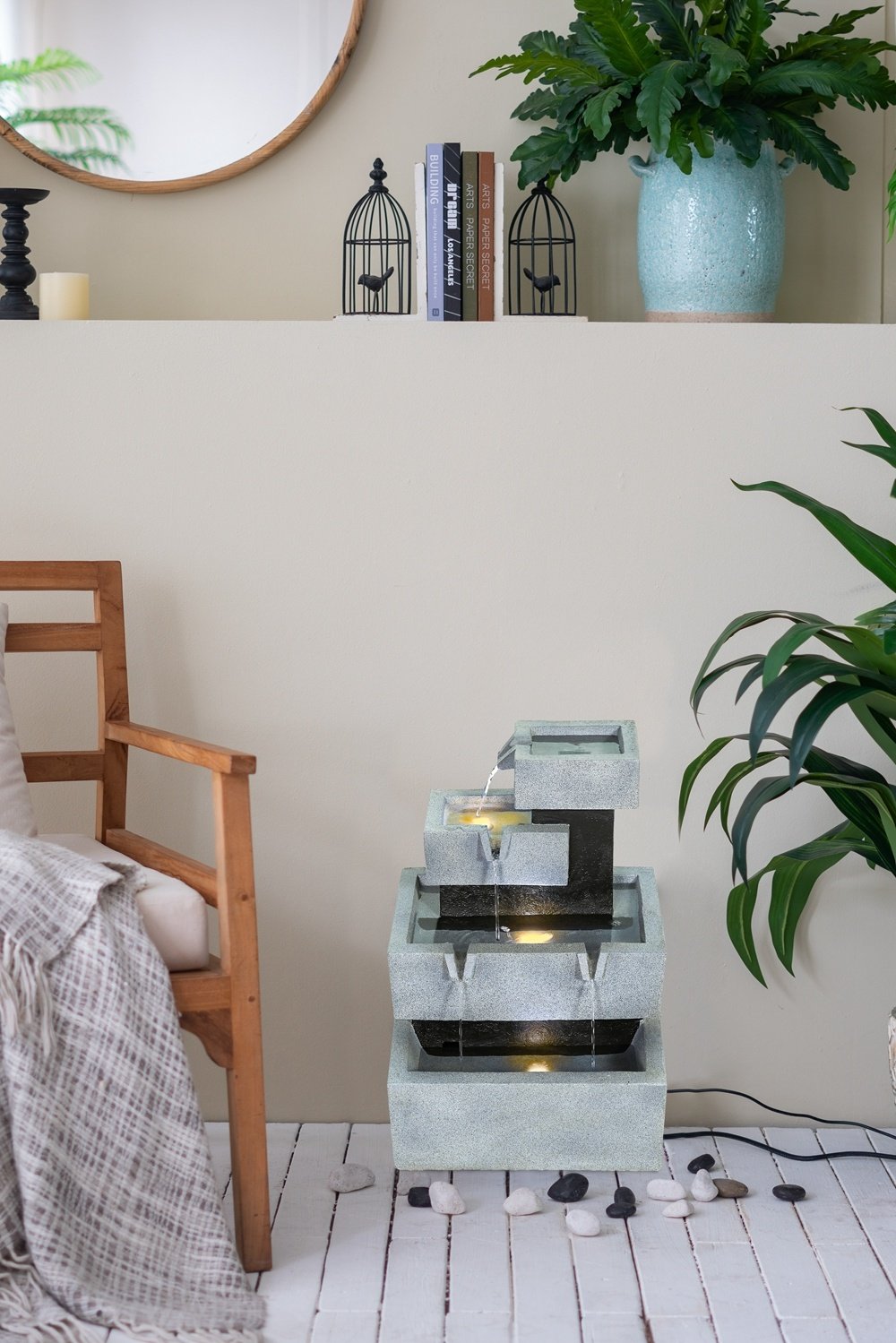 Introduce a modern minimalist flair into your garden, patio, or porch with this alluring water fountain. Boasting an understated blend of light gray and black tones and a four-tiered block-like silhouette, this fountain will elevate your decor while the cascading stream of water spreads a soothing ambiance.