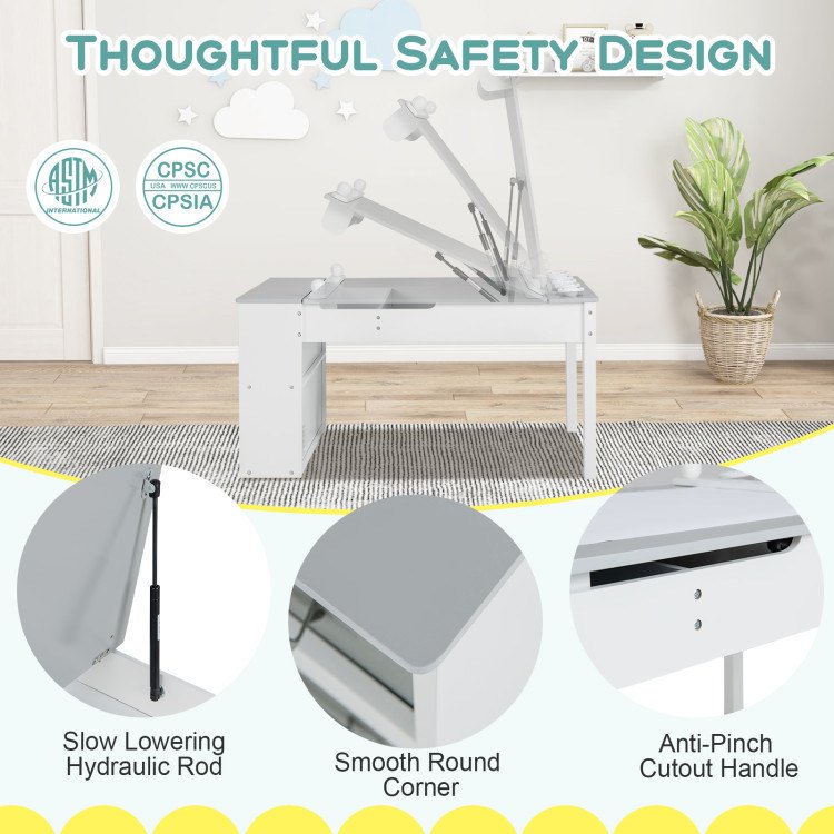 2.Safety Protection: This kids' activity table set is ASTM and CPSIA-certified to bring parents peace of mind. Thoughtful safety design of slow lowering hydraulic rod and cutout handle prevents your little one's fingers from accidentally getting caught. Besides, smooth round corners prevent unexpected injuries.