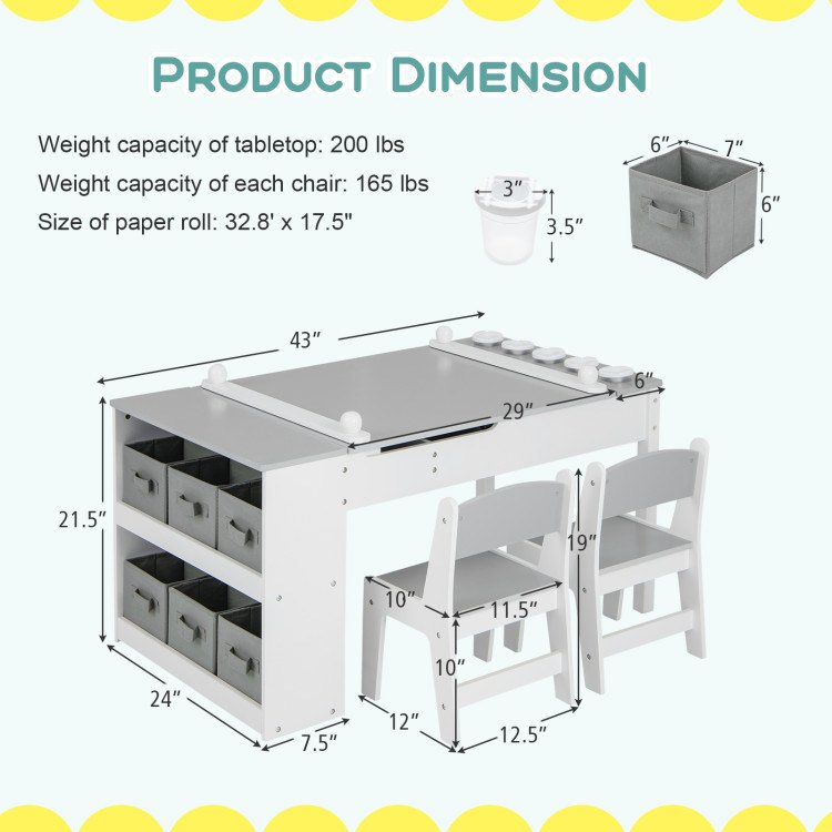 4.Kids Art Table with Paper Roll Holder: The paper roll holder is placed on the back of the desktop (a replaceable paper roll included), which can cultivate children's interest in painting to stimulate imagination and creativity. Plus, 2 chairs are provided for parent-child interaction or for your child to draw with a friend.