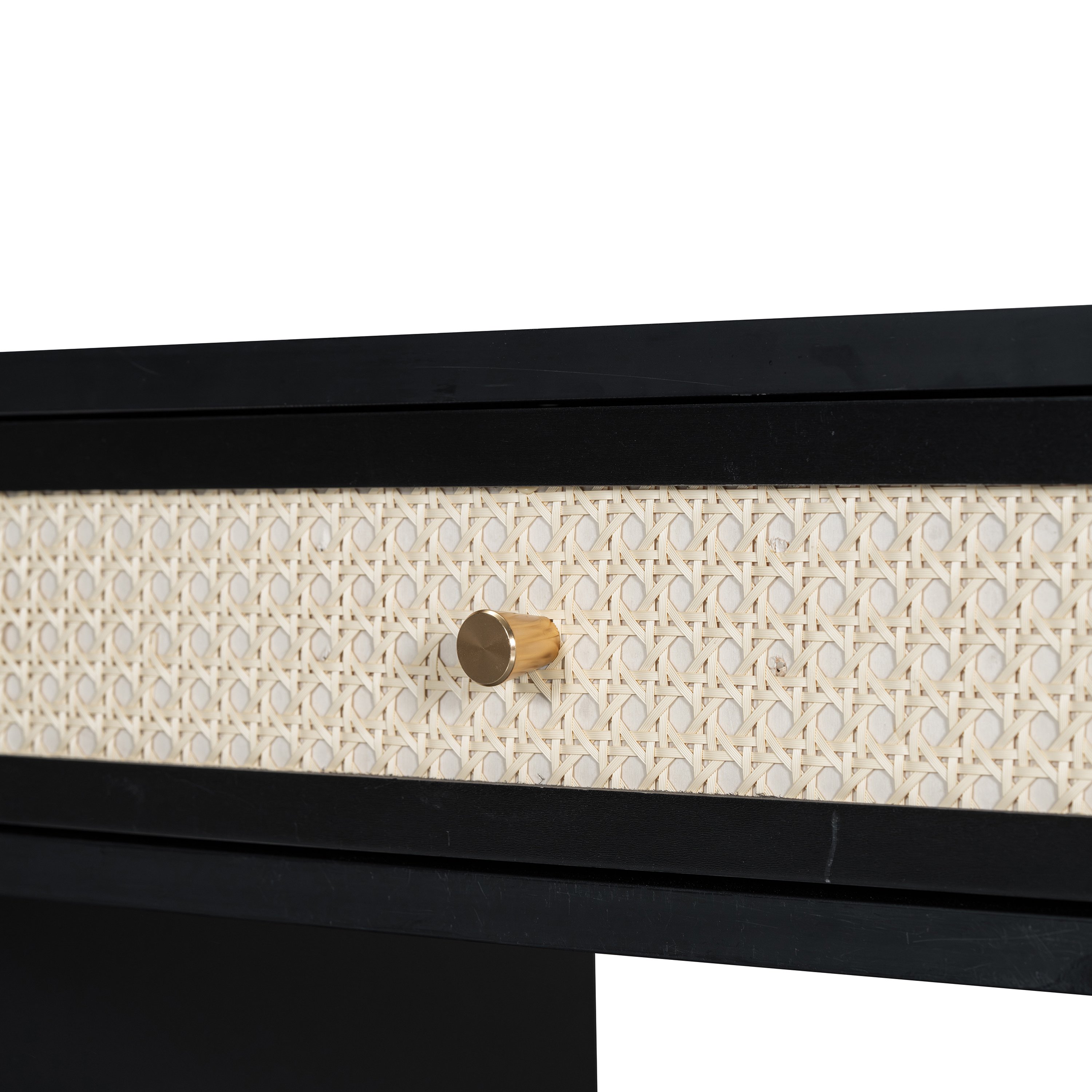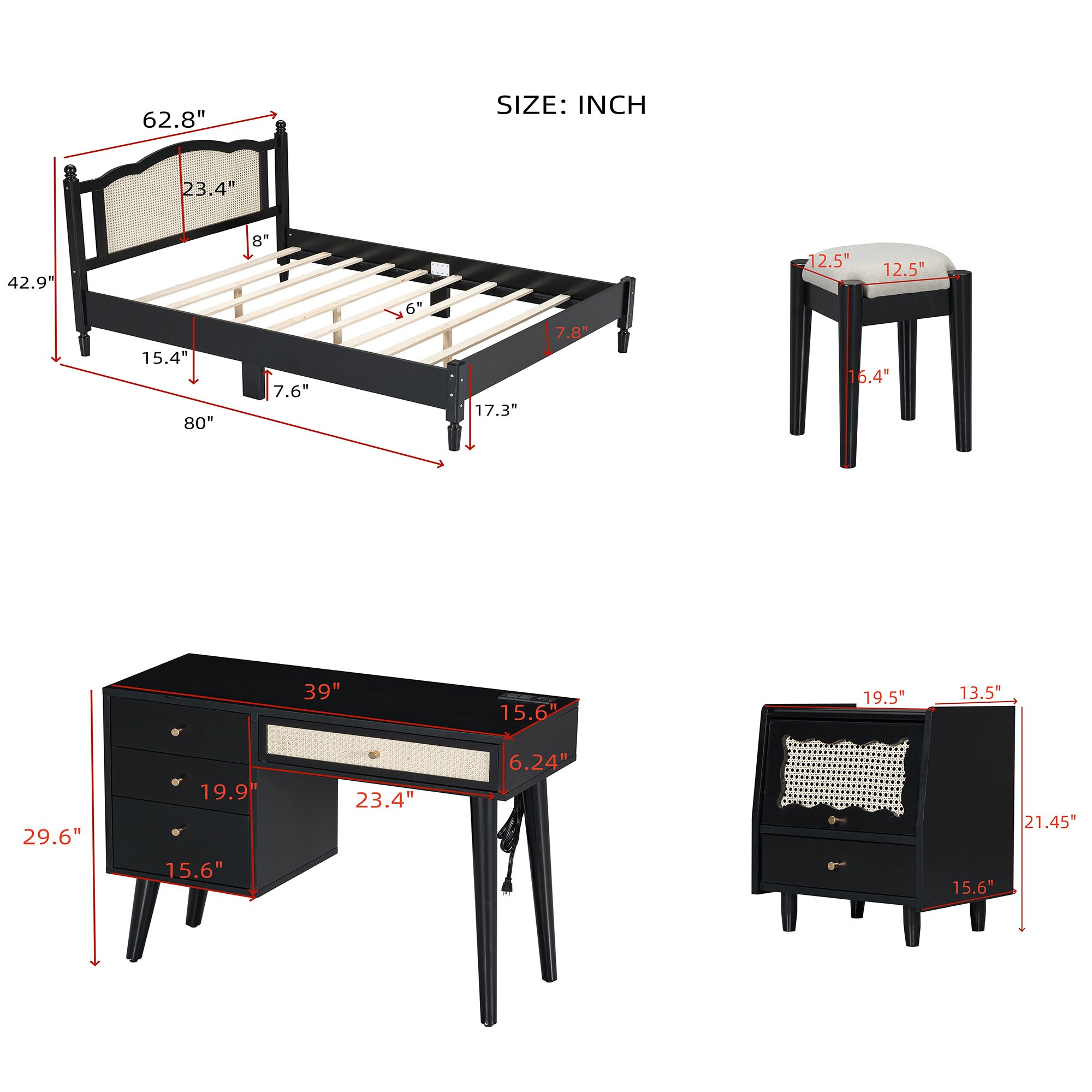 3 Pieces Bedroom Set with Queen Size Wooden Bed Frame, Makeup Vanity Set and Nightstand,BlackThis room set is designed with a simple and retro design. The set includes a bed frame, bedside table and dressing table set. It is a great choice for bedroom decoration. Whether you prefer a cozy beach style, free-spirited bohemian vibes, or a sleek modern look, this rattan headboard will effortlessly enhance the charm of your bedroom.