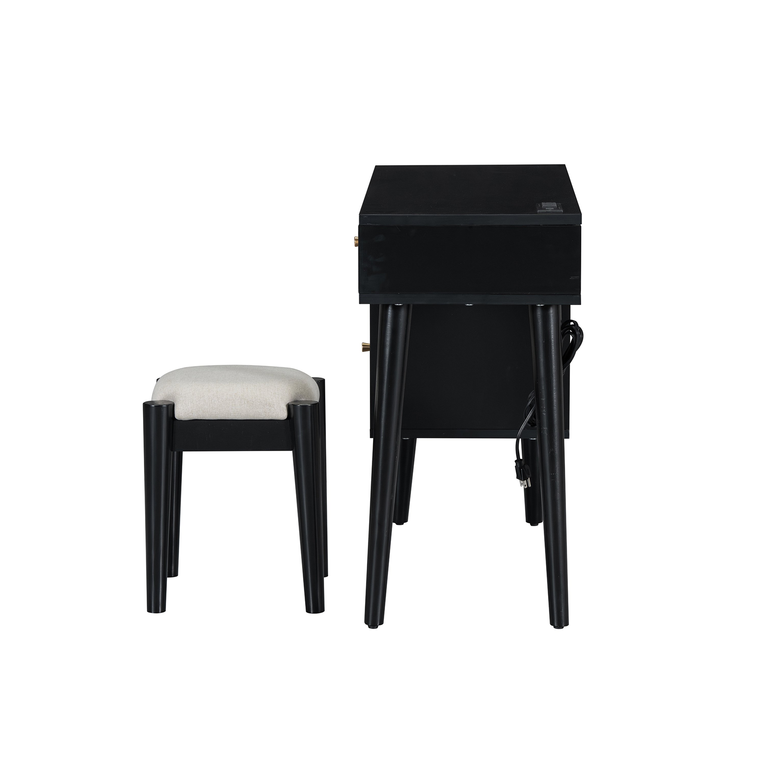 3 Pieces Bedroom Set with Queen Size Wooden Bed Frame, 1 Vintage Nightstand and 1 Makeup Vanity Set with Stool,Black (Expected Arrival Time: 08.23)