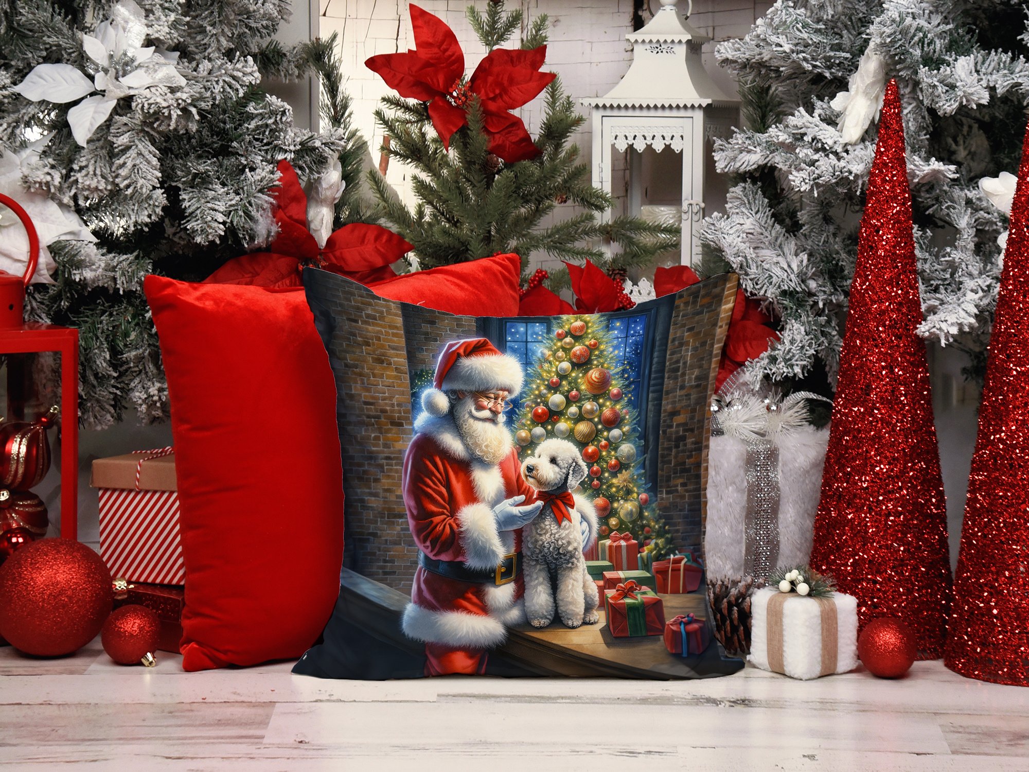 Bedlington Terrier and Santa Claus Throw Pillow Machine Washable, Indoor Outdoor Decorative Pillow for Couch, Bed or Patio, 14Hx14W