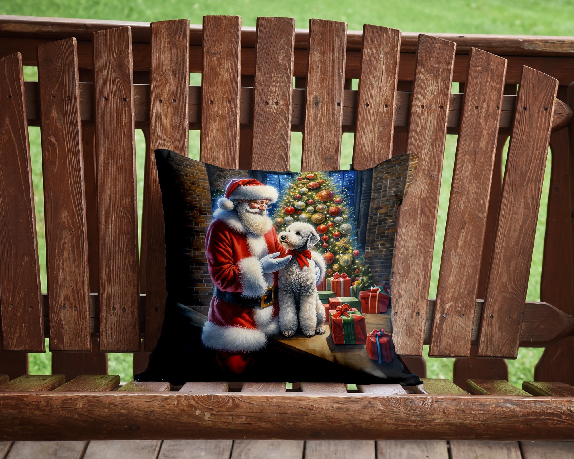 Throw Pillow featuring breed specific Bedlington Terrier artwork. Celebrate Christmas with this Christmas Pillow. Add a touch of vibrancy and comfort to your outdoor seating with Caroline's Treasures Fabric Decorative Pillow. Measuring approximately 14 inches by 14 inches, this outdoor pillow is crafted to elevate the appeal of your patio furniture, infusing it with vivid color and artistic flair. The pillow includes a 100% Polyester Fabric sham filled with a quality pillow form to provide superior comfort. Innovatively made from our brand new material, specifically woven for its water resistance, this pillow is designed for durability. The soft canvas fabric offers versatility in use, fit for your indoor couch or your outdoor patio, porch, or veranda. The fabric is dyed with colorfast dyes built for resilience against weather conditions, ensuring the pillow retains its beauty over time. Constructed by sewing three fabric pieces to create a sham, the polyester insert is then nestled inside to form the pillow, resulting in an overstuffed pillow that maintains its shape. Both the sham and the pillow insert are proudly made in the United States. As the pillows are handcrafted, there may be minor variations in size, further enhancing their unique charm. Experience comfort in style with Caroline's Treasures Fabric Decorative Pillow.