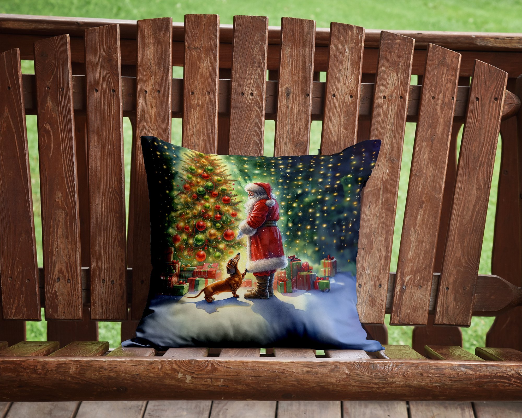 Throw Pillow featuring breed specific Dachshund artwork. Celebrate Christmas with this Christmas Pillow. Add a touch of vibrancy and comfort to your outdoor seating with Caroline's Treasures Fabric Decorative Pillow. Measuring approximately 14 inches by 14 inches, this outdoor pillow is crafted to elevate the appeal of your patio furniture, infusing it with vivid color and artistic flair. The pillow includes a 100% Polyester Fabric sham filled with a quality pillow form to provide superior comfort. Innovatively made from our brand new material, specifically woven for its water resistance, this pillow is designed for durability. The soft canvas fabric offers versatility in use, fit for your indoor couch or your outdoor patio, porch, or veranda. The fabric is dyed with colorfast dyes built for resilience against weather conditions, ensuring the pillow retains its beauty over time. Constructed by sewing three fabric pieces to create a sham, the polyester insert is then nestled inside to form the pillow, resulting in an overstuffed pillow that maintains its shape. Both the sham and the pillow insert are proudly made in the United States. As the pillows are handcrafted, there may be minor variations in size, further enhancing their unique charm. Experience comfort in style with Caroline's Treasures Fabric Decorative Pillow.