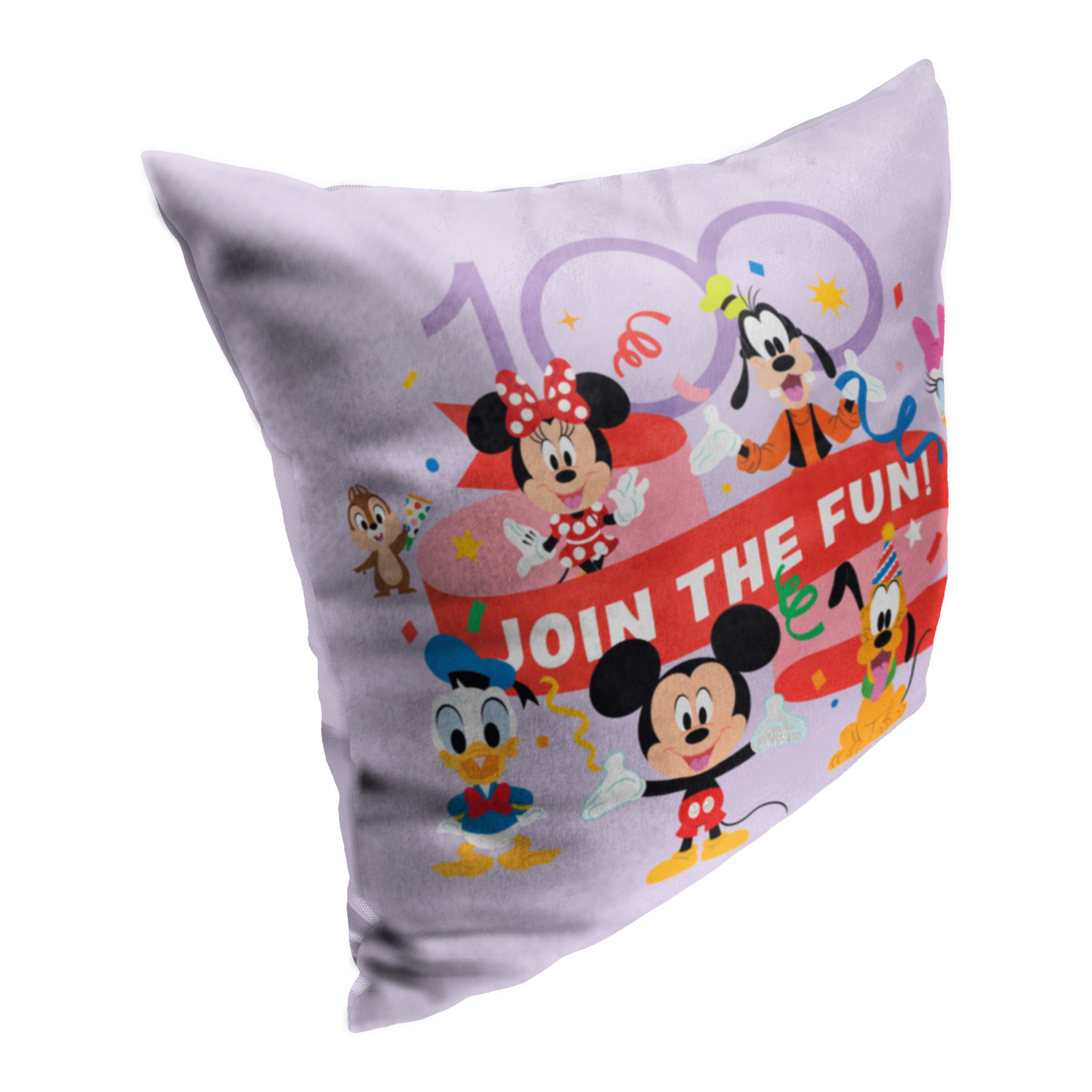 Bring your favorite Disney characters to life with this "Join the Fun" super soft double-sided decorative pillow. Measuring 18 inches by 18 inches and made of 100% polyester, this pillow is perfect for snuggling up with and watching your favorite Disney movies.