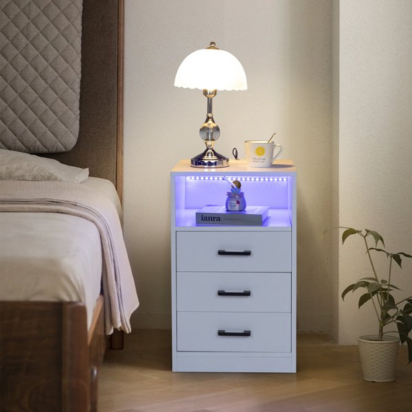 Home > FCH 40*35*65cm Particleboard Pasted Triamine Three Drawers With Socket With LED Light Bedside Table White