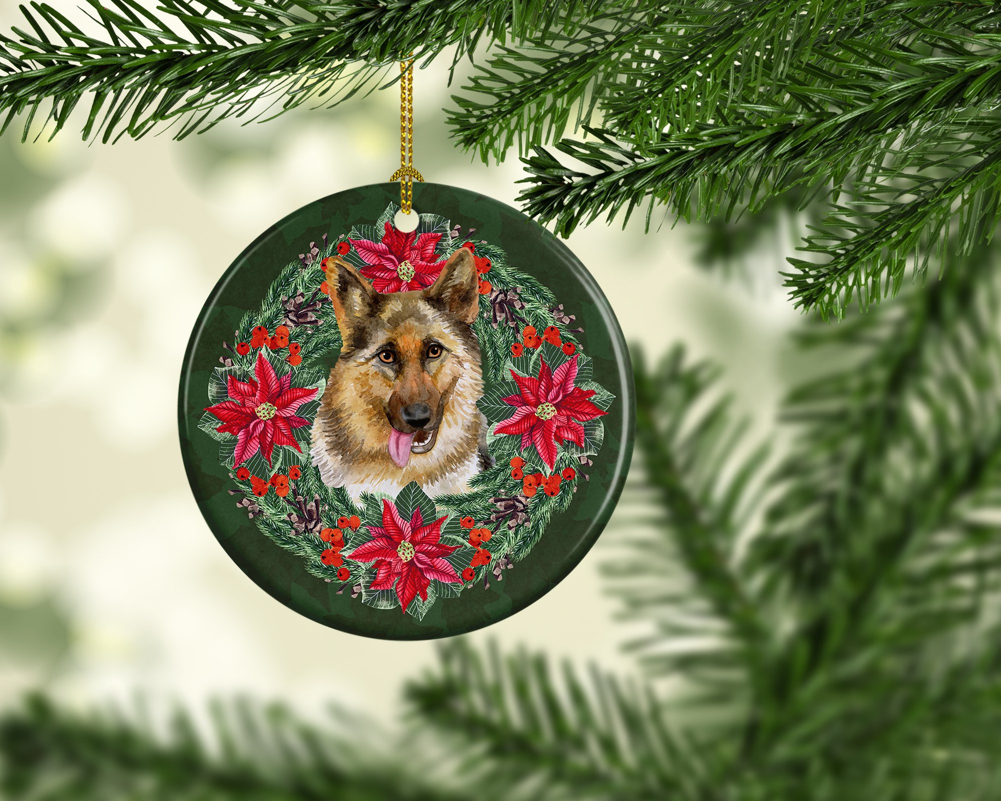 Ceramic Ornament featuring breed specific German Shepherd artwork. Celebrate Christmas with this Christmas Ornament. This Ceramic Ornament is from Caroline's Treasures collection Christmas Poinsetta Wreath. Add a touch of personalized charm to your Christmas tree this holiday season with our Ceramic Ornament. Measuring 2.8125 inches in diameter, this round porcelain ornament beautifully reflects your festive lights, enhancing your holiday decor. The gloss surface sets off the vibrant, full-color artwork contributed by one of our talented artists, bringing a pop of color and joy to your tree. This Ceramic Ornament doesn't stop at being merely decorative. The white back is designed for personalization. Write a heartfelt message, mark a special year, or inscribe a date with a paint pen or a permanent marker to create a treasured memento. Please ensure you allow any personalization to dry thoroughly before handling to maintain the pristine finish. Included with the ornament is a delicate gold cord for easy hanging. Made in the USA, this Ceramic Ornament makes an exceptional gift for a pet sitter, teacher, family member, or anyone you wish to share a little Christmas magic with. With its blend of style, charm, and personal touch, it's a meaningful addition to any Christmas tree. This Ornament is from Caroline's Treasures Dogs category of products.