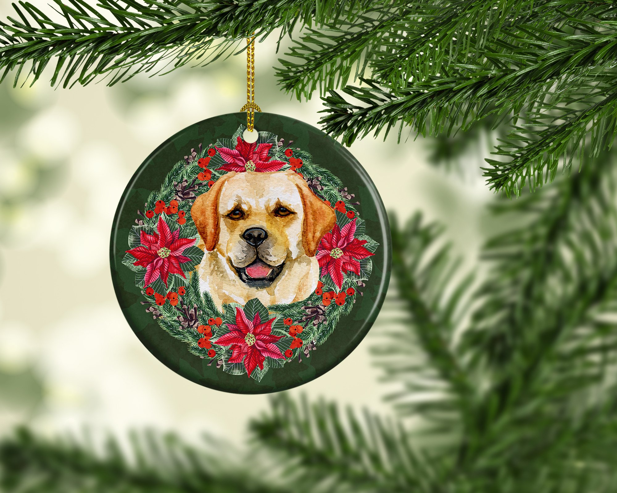 Ceramic Ornament featuring breed specific Golden Retriever artwork. Celebrate Christmas with this Christmas Ornament. This Ceramic Ornament is from Caroline's Treasures collection Christmas Poinsetta Wreath. Add a touch of personalized charm to your Christmas tree this holiday season with our Ceramic Ornament. Measuring 2.8125 inches in diameter, this round porcelain ornament beautifully reflects your festive lights, enhancing your holiday decor. The gloss surface sets off the vibrant, full-color artwork contributed by one of our talented artists, bringing a pop of color and joy to your tree. This Ceramic Ornament doesn't stop at being merely decorative. The white back is designed for personalization. Write a heartfelt message, mark a special year, or inscribe a date with a paint pen or a permanent marker to create a treasured memento. Please ensure you allow any personalization to dry thoroughly before handling to maintain the pristine finish. Included with the ornament is a delicate gold cord for easy hanging. Made in the USA, this Ceramic Ornament makes an exceptional gift for a pet sitter, teacher, family member, or anyone you wish to share a little Christmas magic with. With its blend of style, charm, and personal touch, it's a meaningful addition to any Christmas tree. This Ornament is from Caroline's Treasures Dogs category of products.