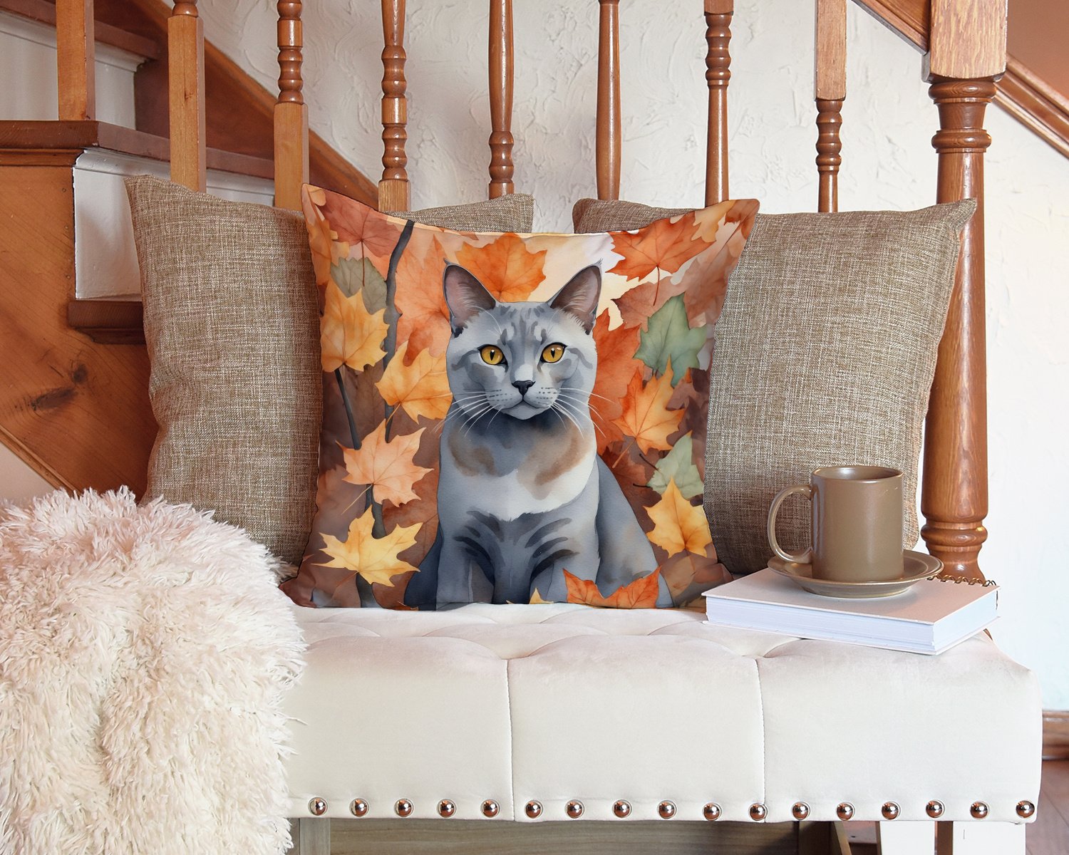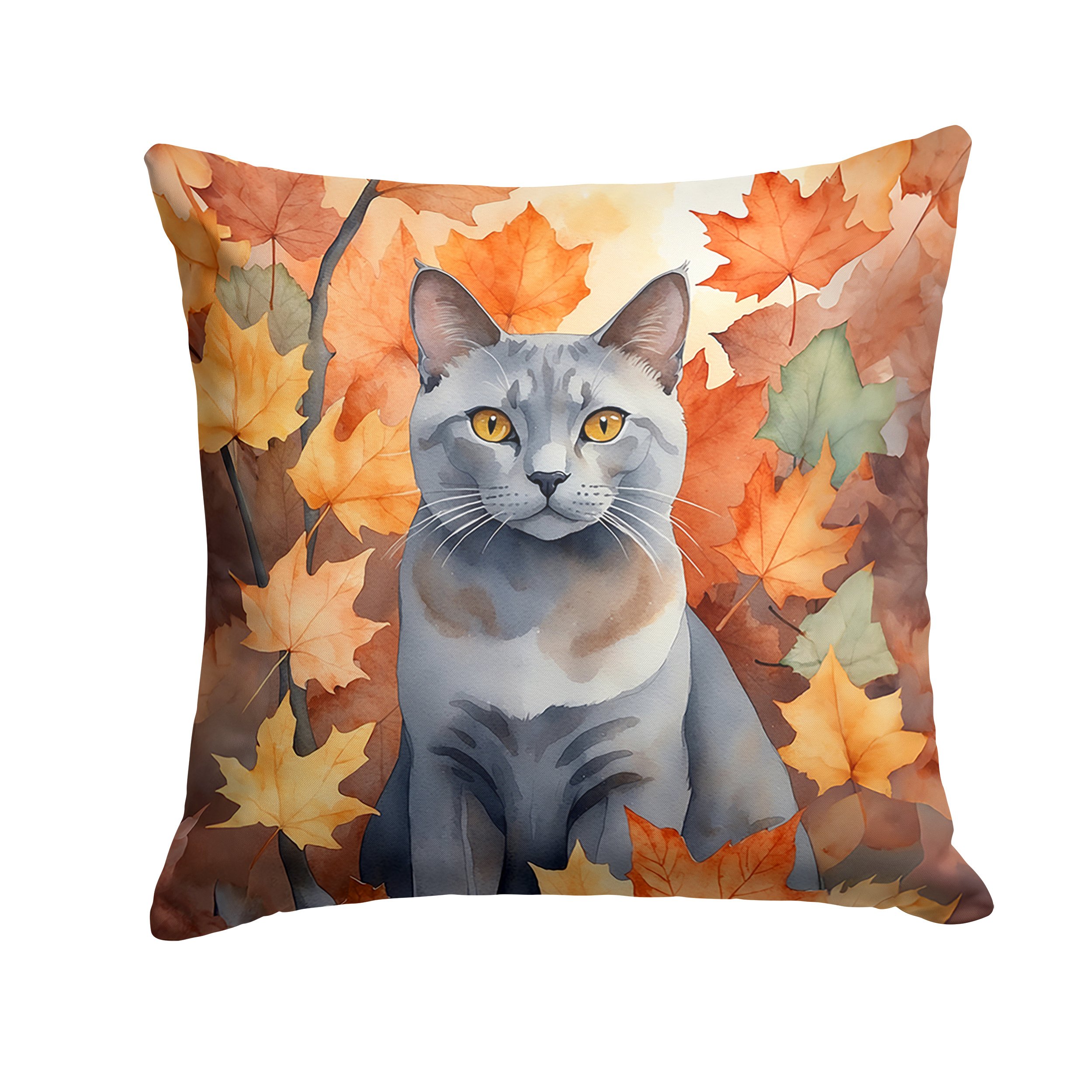 Korat Cat in Fall Leaves Throw Pillow Machine Washable, Indoor Outdoor Decorative Pillow for Couch, Bed or Patio, 14Hx14W