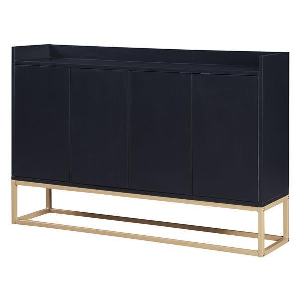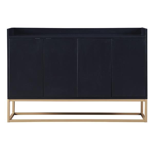 SpecificationFinishUV paintingAssemble required150 minsPackage cartons1 pcProduct load-bearing50 poundsPacking details5-ply brown carton with 6 sides foam protect inside.Our product has passed the dropping test according international standard.Country of originalChinaAssemble requiredYes. And there are all parts, hardware&screw bag and paper instructions in the package.TipsUsing an electric drill for installation can be more labor-saving, but it is important to position the board in advance and drive the screws accurately.NoticeItems may slightly different from photo in terms of color due to the lighting during photo shooting or the monitor's display. Attention please !!! Improper use of screws may cause the product surface damage! Please be careful when installing.This sideboard buffet cabinet features a black cabinet body with gold metal legs, compact look is very suitable for small space. Whole dimensions: 47.2"L x 11.8"W x 31.5"H.The unique feature of this cabinet is that there is no regular door handle. The four straight-opening doors can be opened by the door rebound device only by pressing the middle. When closing, you can firmly close the cabinet door by pressing a little harder. This design brings you convenient and space-saving.The thoughtful countertop fence design allows you to use the countertop more safely. The internal three shelves provide enough storage space, the left single shelf can be adjusted to three heights as well or users can remove it if need. And the right two shelves divide the cabinet into three storage spaces. can be used to store small appliances, dishes, glassware, towels, wine, and anything else you have in mind.High-quality particle board and steel pipe support base create a firm structure. The surface of the triamine sticker is waterproof, smooth and durable, the countertop load-bearing 75 LBS, the shelf load-bearing 25 LBS. It can stand up to daily use even in the long run without losing its stylish charm.Full assembly required. This product comes with detailed instructions, and it can be installed step by step following the instructions, which can help you complete the assembly as soon as possible.
