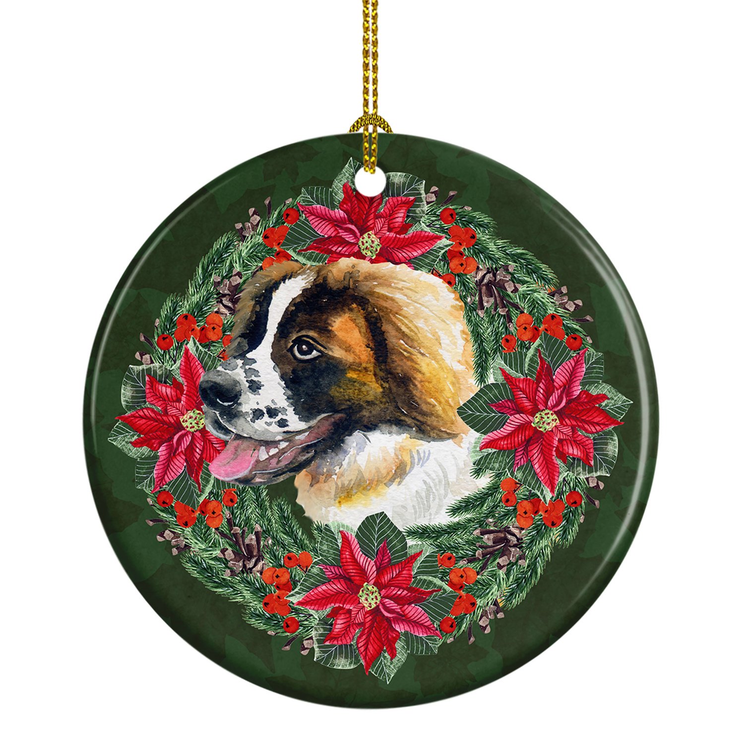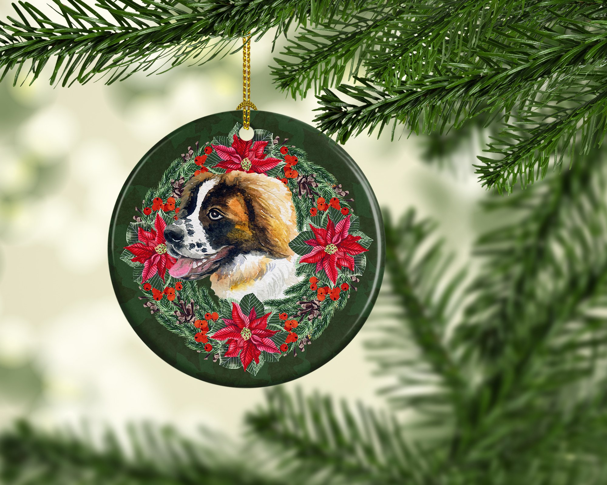 Ceramic Ornament featuring breed specific Saint Bernard artwork. Celebrate Christmas with this Christmas Ornament. This Ceramic Ornament is from Caroline's Treasures collection Christmas Poinsetta Wreath. Add a touch of personalized charm to your Christmas tree this holiday season with our Ceramic Ornament. Measuring 2.8125 inches in diameter, this round porcelain ornament beautifully reflects your festive lights, enhancing your holiday decor. The gloss surface sets off the vibrant, full-color artwork contributed by one of our talented artists, bringing a pop of color and joy to your tree. This Ceramic Ornament doesn't stop at being merely decorative. The white back is designed for personalization. Write a heartfelt message, mark a special year, or inscribe a date with a paint pen or a permanent marker to create a treasured memento. Please ensure you allow any personalization to dry thoroughly before handling to maintain the pristine finish. Included with the ornament is a delicate gold cord for easy hanging. Made in the USA, this Ceramic Ornament makes an exceptional gift for a pet sitter, teacher, family member, or anyone you wish to share a little Christmas magic with. With its blend of style, charm, and personal touch, it's a meaningful addition to any Christmas tree. This Ornament is from Caroline's Treasures Dogs category of products.