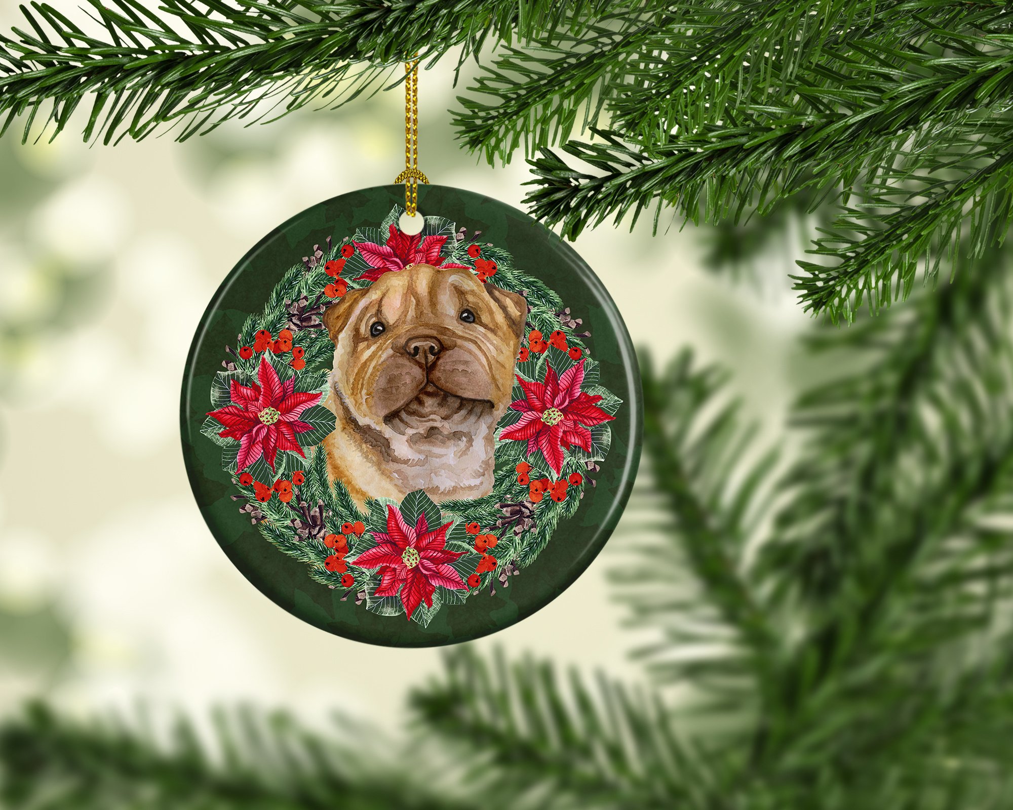 Ceramic Ornament featuring breed specific Shar Pei artwork. Celebrate Christmas with this Christmas Ornament. This Ceramic Ornament is from Caroline's Treasures collection Christmas Poinsetta Wreath. Add a touch of personalized charm to your Christmas tree this holiday season with our Ceramic Ornament. Measuring 2.8125 inches in diameter, this round porcelain ornament beautifully reflects your festive lights, enhancing your holiday decor. The gloss surface sets off the vibrant, full-color artwork contributed by one of our talented artists, bringing a pop of color and joy to your tree. This Ceramic Ornament doesn't stop at being merely decorative. The white back is designed for personalization. Write a heartfelt message, mark a special year, or inscribe a date with a paint pen or a permanent marker to create a treasured memento. Please ensure you allow any personalization to dry thoroughly before handling to maintain the pristine finish. Included with the ornament is a delicate gold cord for easy hanging. Made in the USA, this Ceramic Ornament makes an exceptional gift for a pet sitter, teacher, family member, or anyone you wish to share a little Christmas magic with. With its blend of style, charm, and personal touch, it's a meaningful addition to any Christmas tree. This Ornament is from Caroline's Treasures Dogs category of products.