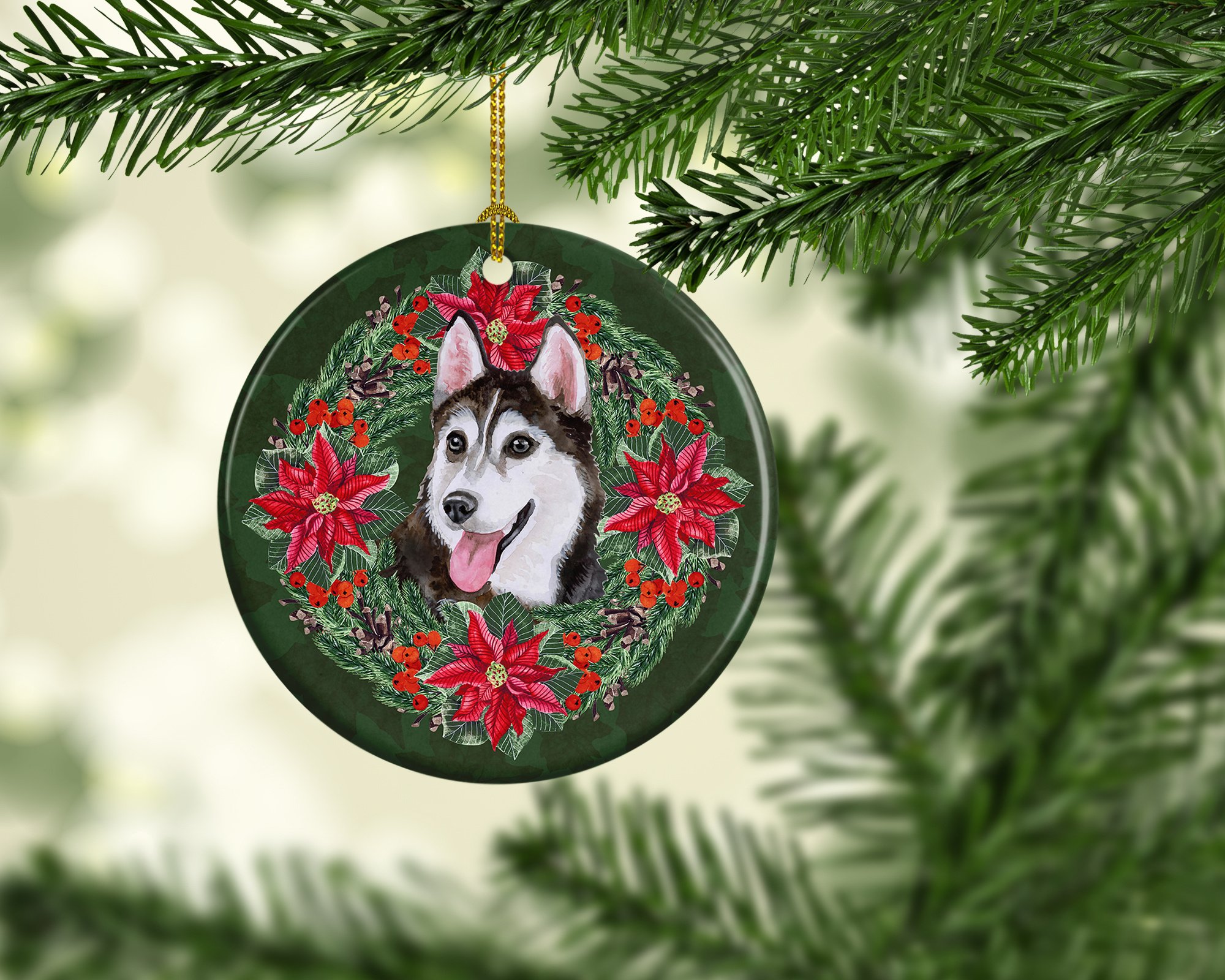 Ceramic Ornament featuring breed specific Siberian Husky artwork. Celebrate Christmas with this Christmas Ornament. This Ceramic Ornament is from Caroline's Treasures collection Christmas Poinsetta Wreath. Add a touch of personalized charm to your Christmas tree this holiday season with our Ceramic Ornament. Measuring 2.8125 inches in diameter, this round porcelain ornament beautifully reflects your festive lights, enhancing your holiday decor. The gloss surface sets off the vibrant, full-color artwork contributed by one of our talented artists, bringing a pop of color and joy to your tree. This Ceramic Ornament doesn't stop at being merely decorative. The white back is designed for personalization. Write a heartfelt message, mark a special year, or inscribe a date with a paint pen or a permanent marker to create a treasured memento. Please ensure you allow any personalization to dry thoroughly before handling to maintain the pristine finish. Included with the ornament is a delicate gold cord for easy hanging. Made in the USA, this Ceramic Ornament makes an exceptional gift for a pet sitter, teacher, family member, or anyone you wish to share a little Christmas magic with. With its blend of style, charm, and personal touch, it's a meaningful addition to any Christmas tree. This Ornament is from Caroline's Treasures Dogs category of products.