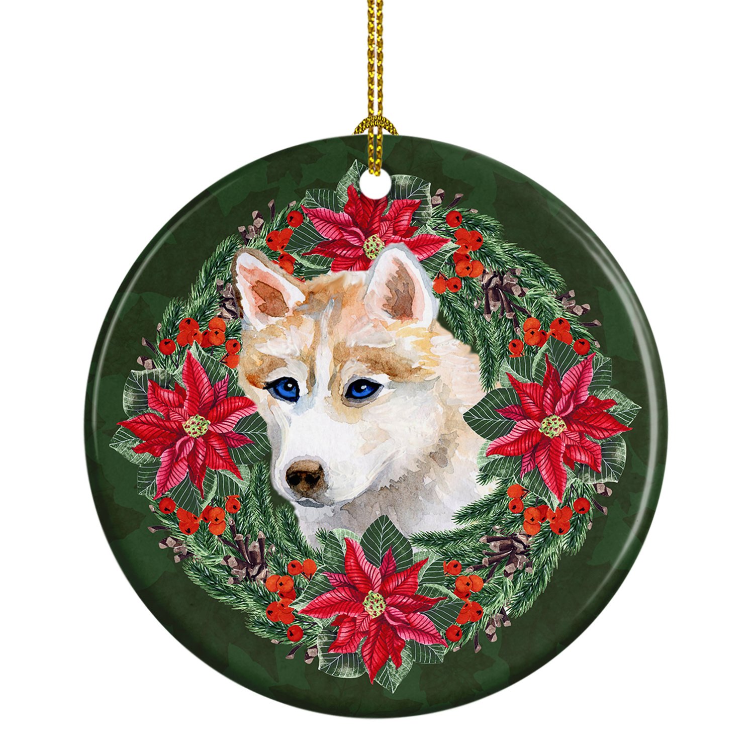 Ceramic Ornament featuring breed specific Siberian Husky artwork. Celebrate Christmas with this Christmas Ornament. This Ceramic Ornament is from Caroline's Treasures collection Christmas Poinsetta Wreath. Add a touch of personalized charm to your Christmas tree this holiday season with our Ceramic Ornament. Measuring 2.8125 inches in diameter, this round porcelain ornament beautifully reflects your festive lights, enhancing your holiday decor. The gloss surface sets off the vibrant, full-color artwork contributed by one of our talented artists, bringing a pop of color and joy to your tree. This Ceramic Ornament doesn't stop at being merely decorative. The white back is designed for personalization. Write a heartfelt message, mark a special year, or inscribe a date with a paint pen or a permanent marker to create a treasured memento. Please ensure you allow any personalization to dry thoroughly before handling to maintain the pristine finish. Included with the ornament is a delicate gold cord for easy hanging. Made in the USA, this Ceramic Ornament makes an exceptional gift for a pet sitter, teacher, family member, or anyone you wish to share a little Christmas magic with. With its blend of style, charm, and personal touch, it's a meaningful addition to any Christmas tree. This Ornament is from Caroline's Treasures Dogs category of products.