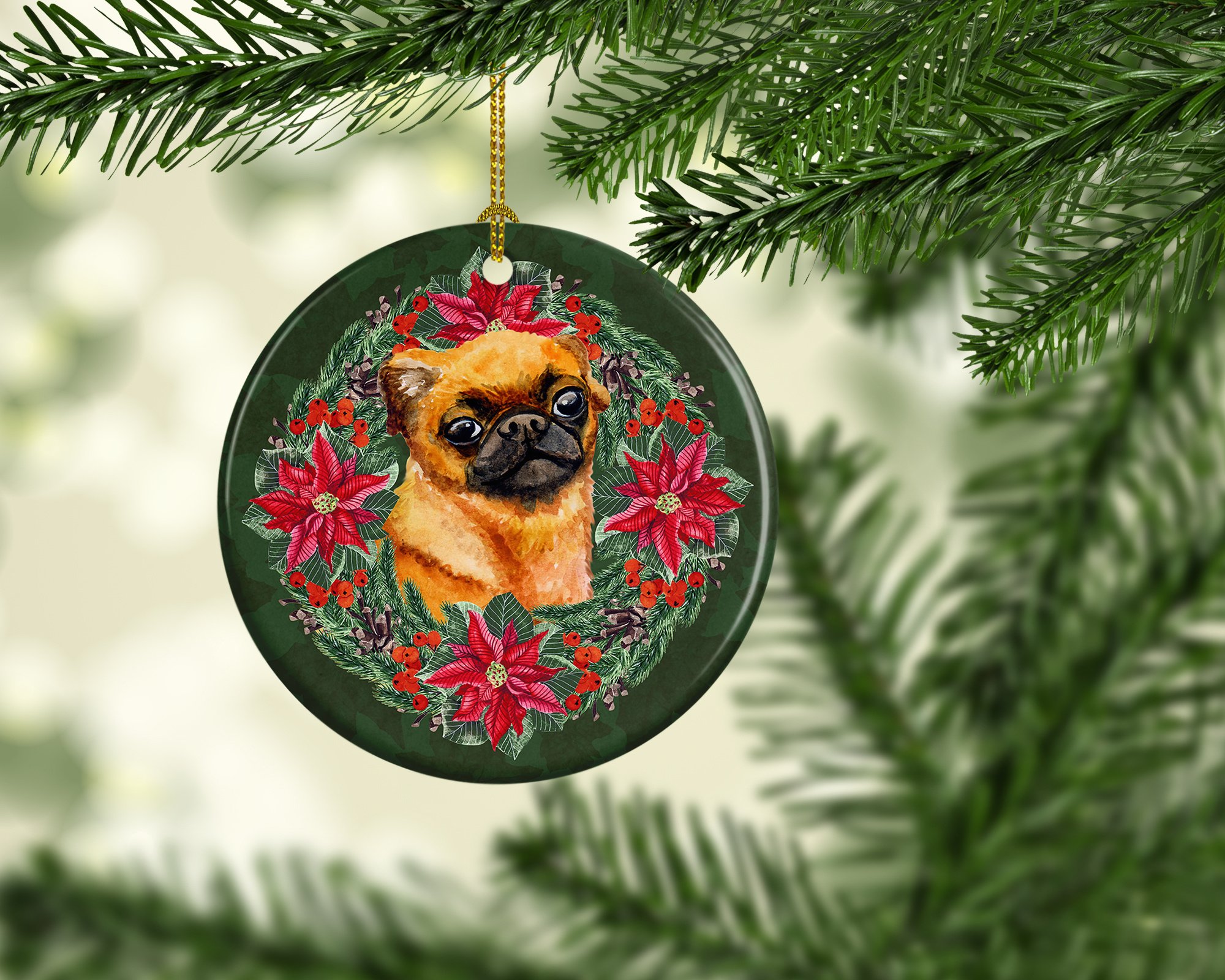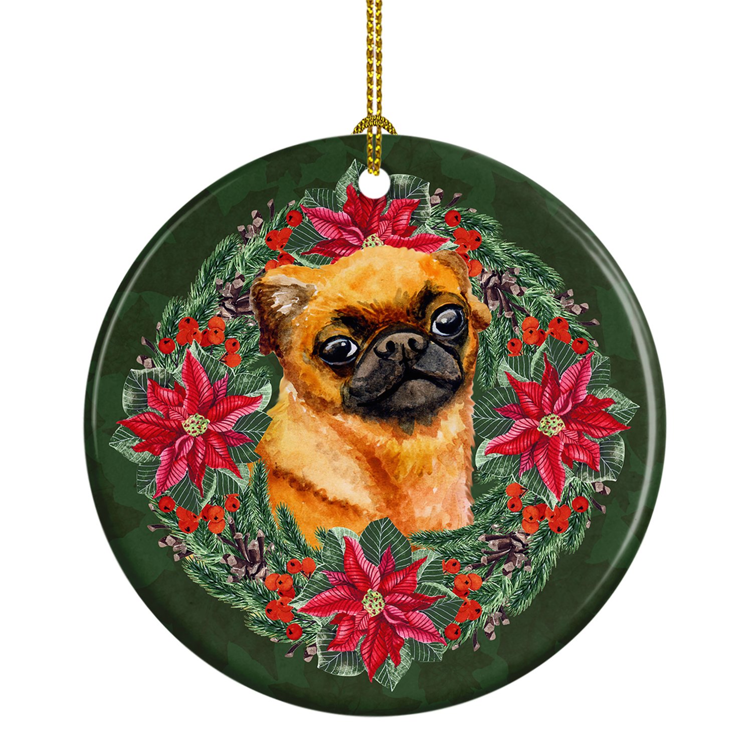 Ceramic Ornament featuring breed specific Brussels Griffon artwork. Celebrate Christmas with this Christmas Ornament. This Ceramic Ornament is from Caroline's Treasures collection Christmas Poinsetta Wreath. Add a touch of personalized charm to your Christmas tree this holiday season with our Ceramic Ornament. Measuring 2.8125 inches in diameter, this round porcelain ornament beautifully reflects your festive lights, enhancing your holiday decor. The gloss surface sets off the vibrant, full-color artwork contributed by one of our talented artists, bringing a pop of color and joy to your tree. This Ceramic Ornament doesn't stop at being merely decorative. The white back is designed for personalization. Write a heartfelt message, mark a special year, or inscribe a date with a paint pen or a permanent marker to create a treasured memento. Please ensure you allow any personalization to dry thoroughly before handling to maintain the pristine finish. Included with the ornament is a delicate gold cord for easy hanging. Made in the USA, this Ceramic Ornament makes an exceptional gift for a pet sitter, teacher, family member, or anyone you wish to share a little Christmas magic with. With its blend of style, charm, and personal touch, it's a meaningful addition to any Christmas tree. This Ornament is from Caroline's Treasures Dogs category of products.