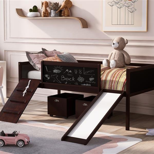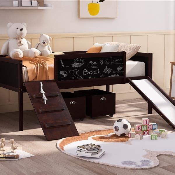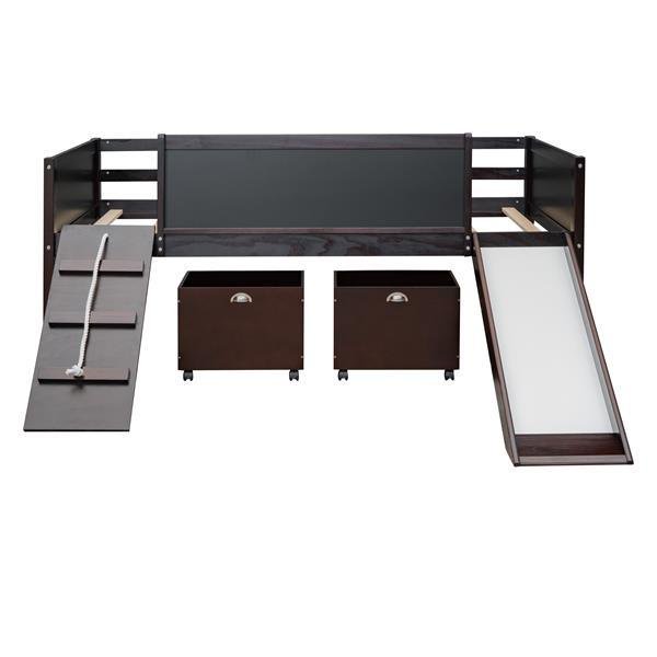 Pet Patio Furniture PE Wicker, Pet Patio EncslosuresThe frame is make of square metal tube, rattan with fluffy PE wicker, the cushion is 2" thickness, with stuffing of 100% polyester fiber cushion, it will survive well from pets scratch. Specifications:Color: Dark GreyMaterial: PE Wicher, Metal Tube, Plastic End Cap. Product Dimensions: W38.5*D27.25*H28.75 InchesWeight :22.05lbPackage Included:1 x Patio Pet Bed[Climbing Frame & Rope] This loft bed comes with a few new elements that a climbing frame is used instead of a ladder, of course, this design adds interest. It is worth mentioning that a climbing rope is prepared for you already.People can experience the joy of climbing every night before going to bed. The climbing experience can also train the your physical coordination gradually.[Pine Wood Frame & Double-sided Chalkboard] This novel design loft bed is manufactured with solid pine frame to guarantee the stability and durability. Pine gave this loft bed good elasticity and breathability, heat conduction performance all right. Three-sides of this loft bed are equipped with double-sided chalkboards, and thoughtful design of the chalk slot.Customer can always pick up chalk and write down their colorful dreams and imaginations in the form of drawing and writing.[Safety & Fun] After waking up,you can get out of bed in the quickest and most happy way every morning due to the slide setting. And the bottom plate of the slide is MDF, the smooth surface of the plate let your experience the fun of sliding. The wood lath and side rail of this loft bed are made of plywood. This sort of wood lath design allow air to pass freely beneath the bed, keeping cool and ensuring mattress maintains its freshness and long-term longevity.[Additional Storage Boxes] Considering the storage of many daily items, Two storage boxes is shipped with this functional loft bed to meet your needs on this aspect. These two storage boxes is made of plywood and without cover, they are the perfect storage space for all kinds of tools. The casters for storage boxes can be lock in place to fix the location beneath the bed.Dimensions: Overall Product Dimension:78.5"x 79.2"x 34"(L x W x H). Mattress not included. Some assembly is required, although we have provided clear instructions and tools.