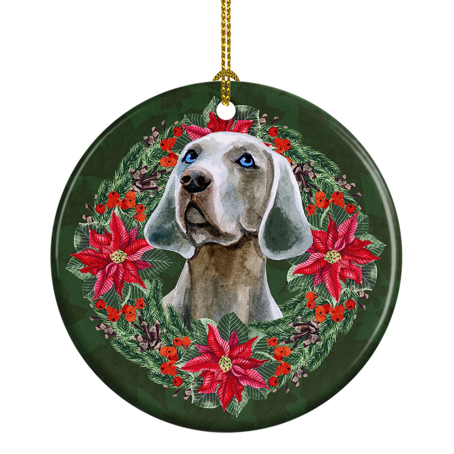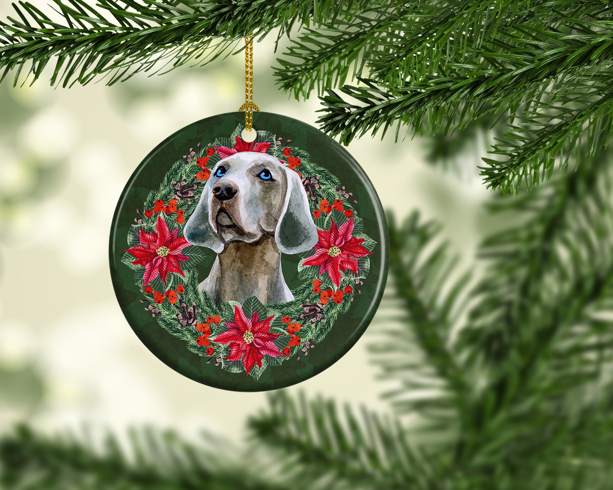 Ceramic Ornament featuring breed specific Weimaraner artwork. Celebrate Christmas with this Christmas Ornament. This Ceramic Ornament is from Caroline's Treasures collection Christmas Poinsetta Wreath. Add a touch of personalized charm to your Christmas tree this holiday season with our Ceramic Ornament. Measuring 2.8125 inches in diameter, this round porcelain ornament beautifully reflects your festive lights, enhancing your holiday decor. The gloss surface sets off the vibrant, full-color artwork contributed by one of our talented artists, bringing a pop of color and joy to your tree. This Ceramic Ornament doesn't stop at being merely decorative. The white back is designed for personalization. Write a heartfelt message, mark a special year, or inscribe a date with a paint pen or a permanent marker to create a treasured memento. Please ensure you allow any personalization to dry thoroughly before handling to maintain the pristine finish. Included with the ornament is a delicate gold cord for easy hanging. Made in the USA, this Ceramic Ornament makes an exceptional gift for a pet sitter, teacher, family member, or anyone you wish to share a little Christmas magic with. With its blend of style, charm, and personal touch, it's a meaningful addition to any Christmas tree. This Ornament is from Caroline's Treasures Dogs category of products.