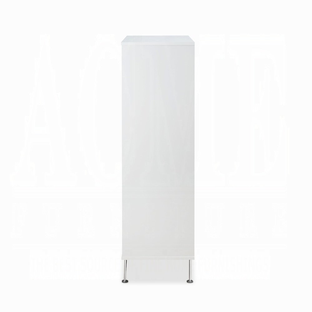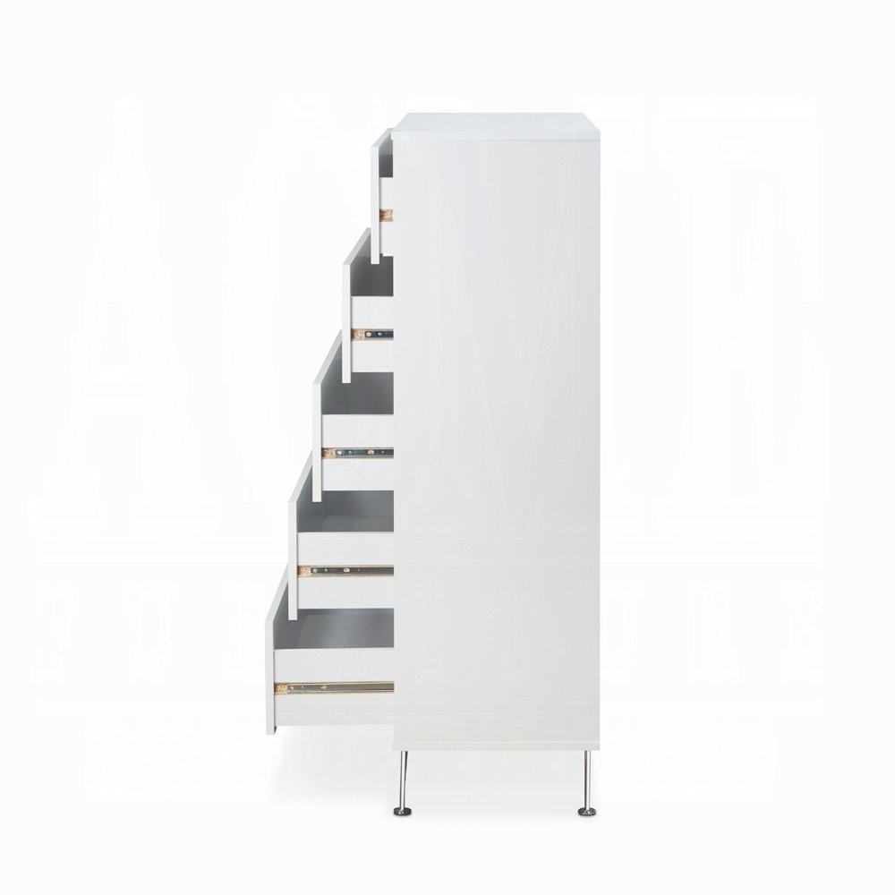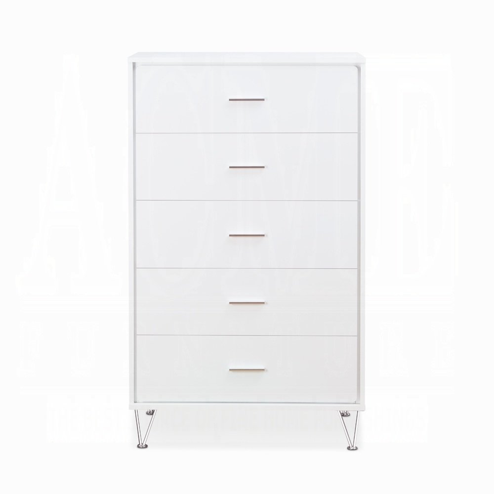 Featuring 5 drawers, a durable wooden case-frame, and chic chrome-finished metal legs, this item is equipped with side metal glide drawers for convenient organization