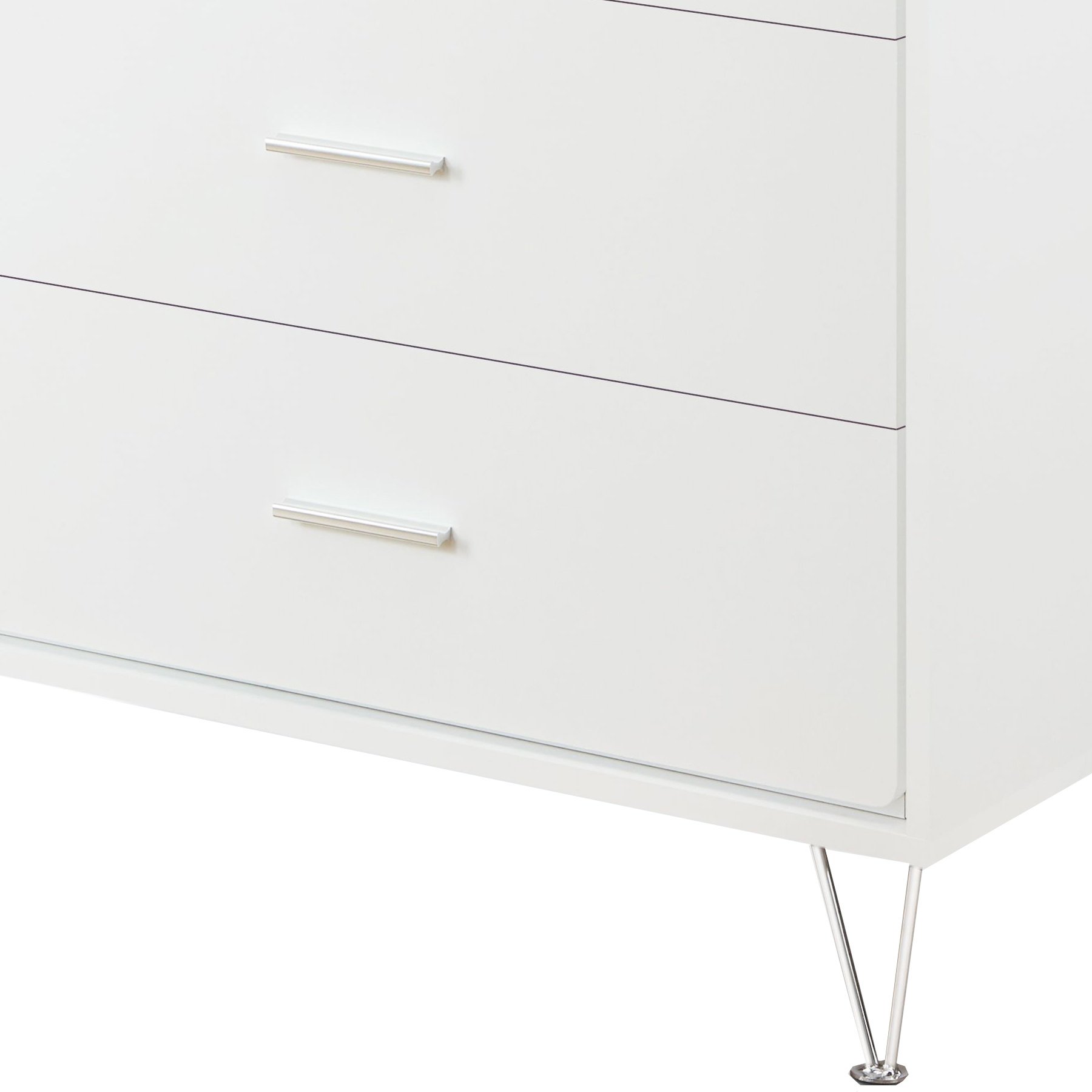 This piece combines 5 spacious drawers, a solid wooden case-frame, and stylish chrome-finished metal legs, along with side metal glide drawers for effortless operation