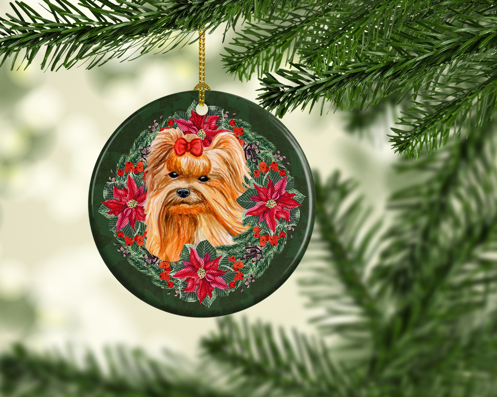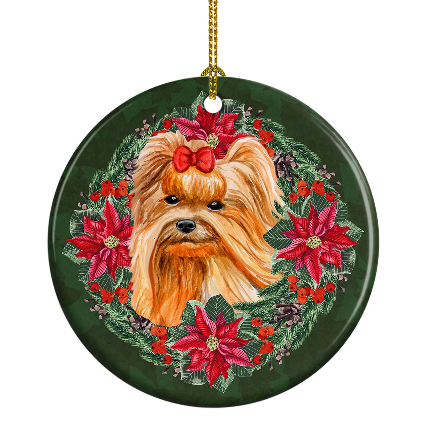 Ceramic Ornament featuring breed specific Yorkshire Terrier artwork. Celebrate Christmas with this Christmas Ornament. This Ceramic Ornament is from Caroline's Treasures collection Christmas Poinsetta Wreath. Add a touch of personalized charm to your Christmas tree this holiday season with our Ceramic Ornament. Measuring 2.8125 inches in diameter, this round porcelain ornament beautifully reflects your festive lights, enhancing your holiday decor. The gloss surface sets off the vibrant, full-color artwork contributed by one of our talented artists, bringing a pop of color and joy to your tree. This Ceramic Ornament doesn't stop at being merely decorative. The white back is designed for personalization. Write a heartfelt message, mark a special year, or inscribe a date with a paint pen or a permanent marker to create a treasured memento. Please ensure you allow any personalization to dry thoroughly before handling to maintain the pristine finish. Included with the ornament is a delicate gold cord for easy hanging. Made in the USA, this Ceramic Ornament makes an exceptional gift for a pet sitter, teacher, family member, or anyone you wish to share a little Christmas magic with. With its blend of style, charm, and personal touch, it's a meaningful addition to any Christmas tree. This Ornament is from Caroline's Treasures Dogs category of products.